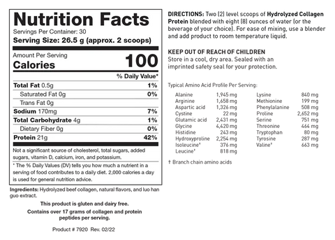 Two (2) level scoops of Hydrolyzed Collagen Protein blended with eight (8) ounces of water (or the beverage of your choice). For ease of mixing, use a blender and add product to room temperature liquid. KEEP OUT OF REACH OF CHILDREN