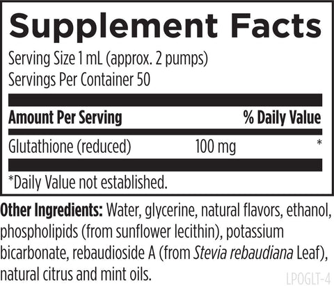 Liposomal Glutathione delivers 100 mg of reduced glutathione in a lemon-peppermint flavor per 2-pump serving. This product is formulated using liposomal technology, which results in superior delivery, absorption, and bioavailability. Liposomal delivery bypasses proteolytic degradation in the gastrointestinal (GI) tract and is uniquely effective for reaching and interacting with target tissues. Thus, this technology helps to overcome the absorption challenges typically faced with oral glutathione supplementation.  Glutathione is considered the body’s “master” antioxidant. It helps protect cells against the effects of oxidative stress from dietary and environmental free radicals, and those resulting from normal metabolic processes.* Glutathione also serves as a key factor in proper detoxification.*